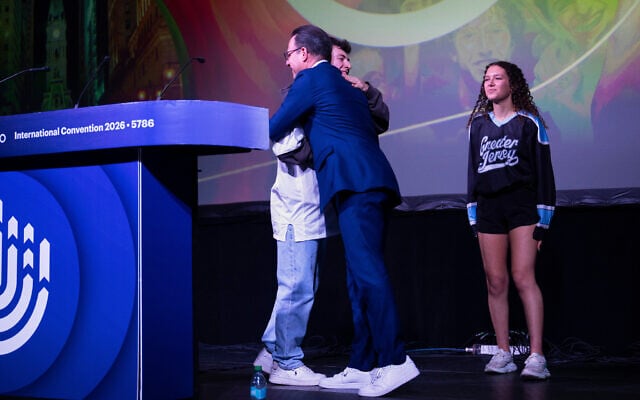 Pennsylvania Gov. Josh Shapiro greets speakers during a B'nai B'rith Youth Organization International Convention in Philadelphia, February 12, 2026. (Joe Lamberti/AP)